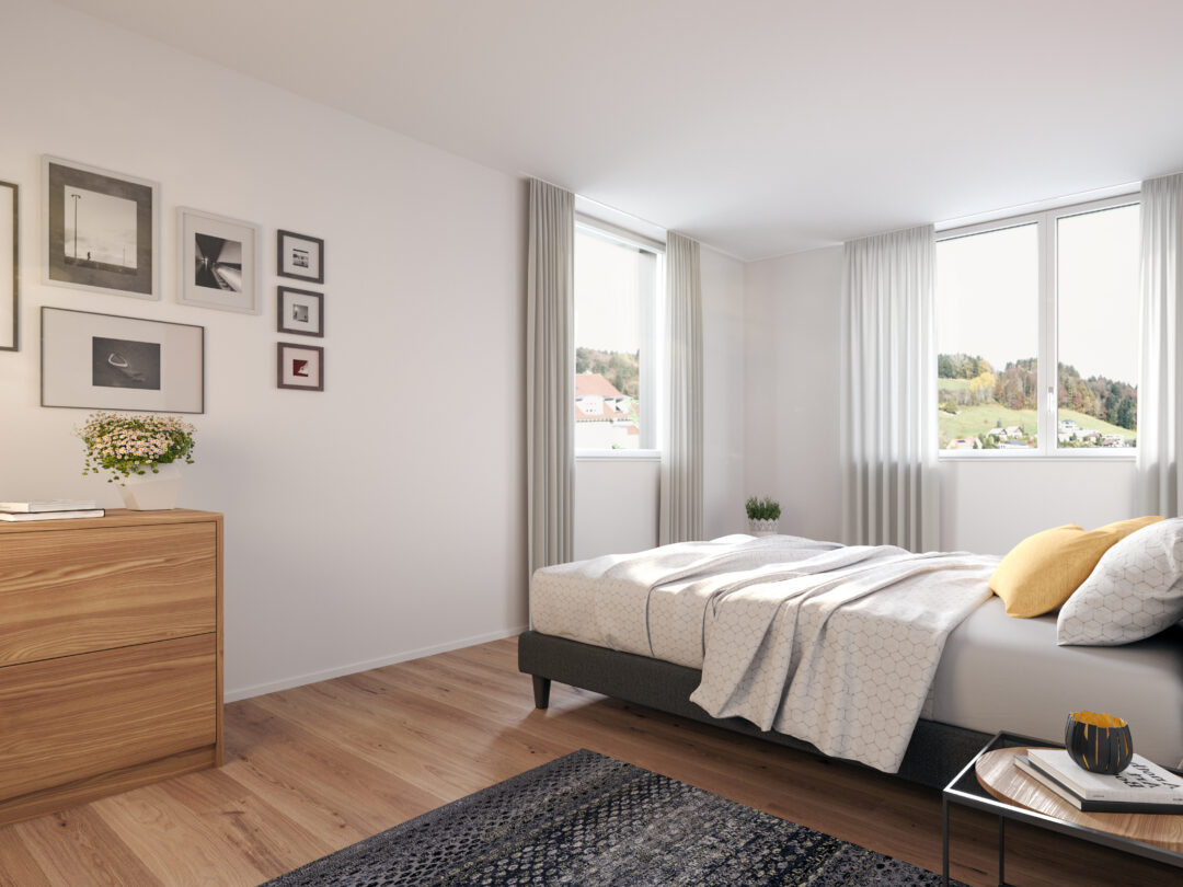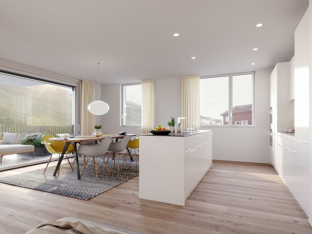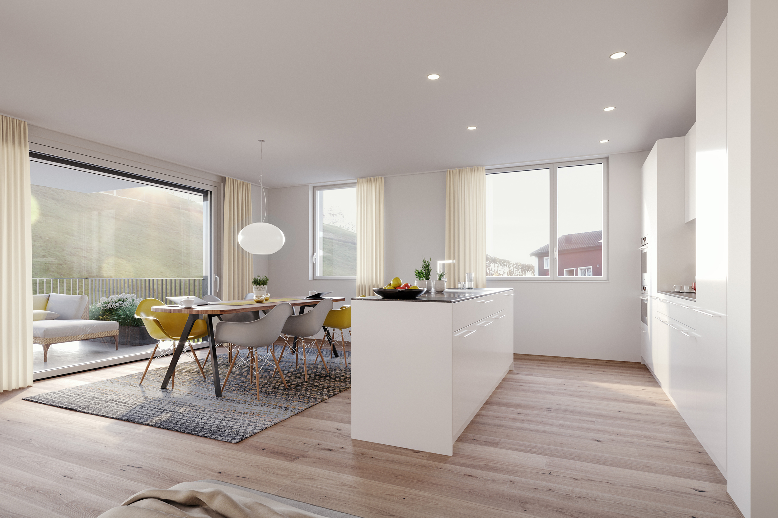 Mitten im Grünen platziert und optimal nach Süden ausgerichtet entstehen im Erdgeschoss 3 ½- und 4 ½-Zimmer-Wohnungen mit schönem Sitzplatz und eigenem Gartenanteil, im Obergeschoss mit grossen Sonnenterrassen. Die 5 ½-Zimmer-Wohnungen im Dachgeschoss überzeugen mit einer schönen Raumhöhe und welche jeweils zusätzlich einen direkten Liftzugang und grosse, überdachte Terrassen verfügen. Im Untergeschoss sind geräumige Kellerabteile sowie die Parkplätze angelegt. Alle Geschosse und Wohnungen sind bequem und barrierefrei per Lift zugänglich.